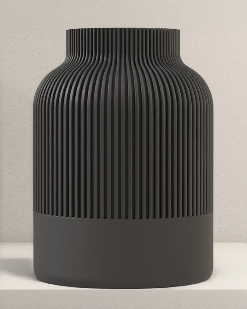 Tiene una textura acanalada jugando con la luz y profundidad, mientras la base sólida ancla el espacio con calma.