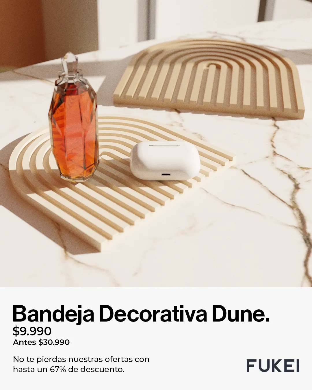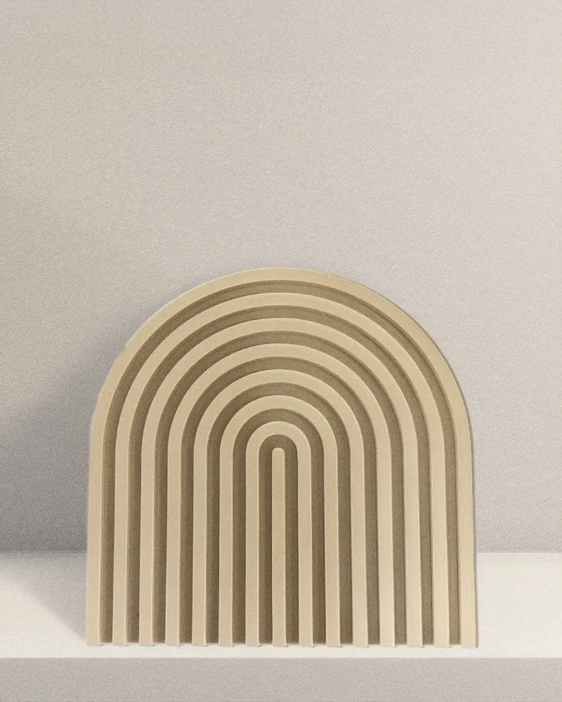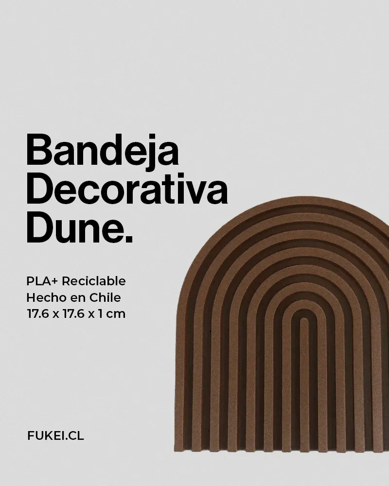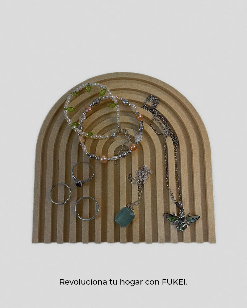 posee un perfil bajo con relieve de arcos tipo duna que juega con la luz. Ideal para llaves, joyas o accesorios y para ordenar sin saturar la escena.